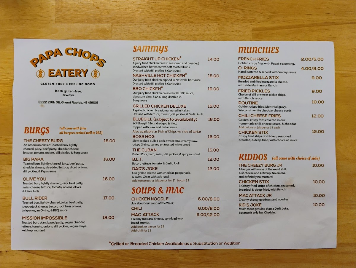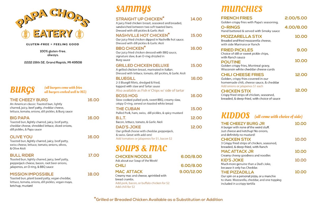 Welcome to Papa Chops Eatery, a vibrant gem located at 2222 28th St SE, Grand Rapids, MI. This eatery takes pride in being 100% gluten-free, offering a delightful selection of dishes that cater to all palettes without compromising on taste.